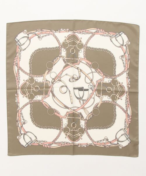 ヴィンテージライクなムード漂うベルト柄スカーフ。落ち着きのある配色使いが大人っぽく、甘すぎない印象で使えるデザインです。首元に巻いたり、バッグのハンドルに結んでアクセントにしても自由にアレンジできるアイテムです。