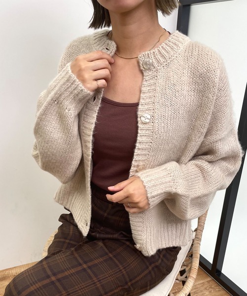 2022 秋冬 AW トレンドアイテム WEB限定 【ふんわりやわらかなモヘアタッチのニットカーディガン】 大人気のモヘアタッチカーディガンが今年も登場 ▼Design ・毛足の長いニットで表情ある一枚となっています。 ・ベーシックなクルーネックでどんなインナーにも合わせやすいのが◎ ・キャンディーのようなボタンがキュートなアクセントに。 ・スタイリング映えする豊富なカラーバリーエーション。 ▼Fabric ・ふわっとしたやわらかさは着心地も見栄えも◎ ・ずっと触っていたくなる、モヘアタッチの滑らかで優しい肌触り。 ▼Styling ・シンプルなTシャツ、ハイネックトップスと合わせてもまとまりを見せたコーデに◎ ・ロングボトム、ショートボトム問わず相性抜群◎ ・豊富なカラーバリエーションから雰囲気や好みに合わせてのスタイリングも魅力的です。 ・寒いときにはコートやジャケットのミドルレイヤーアイテムとして、ほど良いアクセントに。 ・合わせ次第で、カジュアルの度合いを変えられるのも魅力的です。 ----------------------------------------- 【以下レンガ参考。カラーにより多少の誤差あり】 ・透け感:やや透ける ・伸縮性:あり ・生地の厚さ:薄い ・裏地:なし ----------------------------------------- 【スタッフ着用コメント】 身長159cm 実際に着用してみると肌触りが滑らかで着心地がとても良いです。 表面の毛足の長さが 柔らかい雰囲気を演出してくれるので、Tシャツやキャミソールに羽織ってもしっかりと決まります。 カジュアルチックなアイテムですが、パステル風なカラーもあるので優しく大人びた コーデにも仕立てる事も可能です。 単体での着用も、 コーデのアクセントとしても重宝できるファッショナブルなアイテムとなっています。 ●ニット製品で生地が伸びやすいため、サイズに若干の誤差が生じる場合がございます。予めご了承くださいませ。