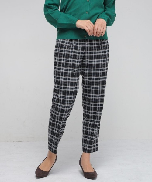 裾に向かって細くなるすっきりとしたシルエットがきれいなテーパードパンツ。センタープレスで縦のラインを強調し、脚をより長く見せてくれます。 ストレッチの利いたツイル素材と後ろウエストゴムでストレスフリーなはき心地◎ 裏地付きで透けも気にならず安心。 季節先取りの落ち着いたチェック柄で、オフィススタイルにもおすすめです。 ※後ウエスト部分ゴム※後ポケットみせかけです。※前中心ファスナー開き●裏地/あり品番:557-73-521
