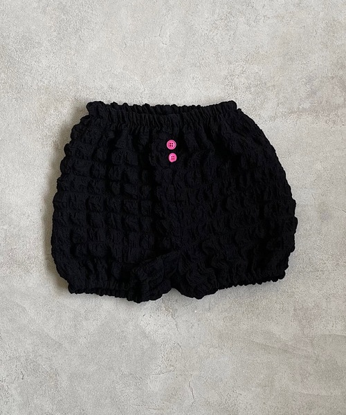 【CALMiA】 見た目もおしゃれな"ポコポコ"シリーズ! こちらは可愛いベビーブルマ。 表面感のあるポコポコと凸凹のあるシャーリング生地。 伸縮性が高くストレスのない着心地です♪ いつものコーデに旬なアクセントをプラス! ふんわりまぁるいシルエットに♪ ウエストと足入れ部分はゴム仕様なので、動きやすくお着替えもラクチンです。 アクセントカラーのボタンがポイントです☆ ボディシャツとコーディネートしていただくのもオススメ。 出産祝いやお誕生日のギフトにされてもGOOD★ [生地について] 表面の凸凹の出方に個体差がございます。予めご了承くださいませ。