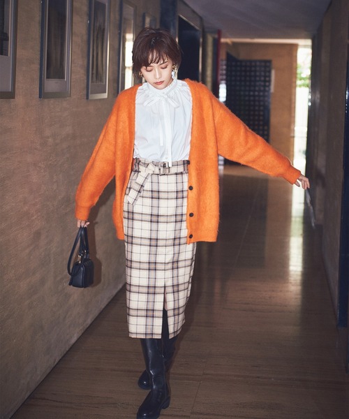 秋冬ムード高まるチェック柄タイトスカート。共布ベルトをセットした、シンプルなタイトシルエット。ウエストの後ろはファスナー&ゴム仕様で、ブラウスやニットをINするとシルエットが綺麗に引き立ちます。ブーツとも相性の良い長めの丈感に、センタースリットをいれ足さばき良好です。