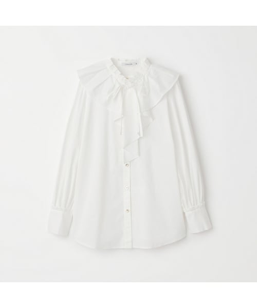 大きめのラッフル衿が2022年秋冬のトレンドを感じられるブラウス【素材】ホワイト、パープル、ベージュの3色展開。ホワイト・パープルには、トルコで生産されたオーガニックコットンを使用したブロード素材を使用。ポリエステルを混ぜることで、程よいハリとクリーンな表面が特徴の素材です。ストレッチ性もあるので気心地も良好です。ベージュには、タテ糸にコットン、ヨコ糸にストレッチ性ポリエステルを配した交織タイプライター素材を使用。綿の風合いを活かしつつ、ヨコ糸の特性でハリ感のある素材です。タンブラー加工を施し、程よくナチュラルな表情に仕上がっています。【シルエット/デザイン】取り外し可能なラッフル衿がポイントのブラウス。ボリュームのある袖とカフスに付いたタックフリルも上品でモードな印象を醸し出しています。ラッフル衿は取り外すことができるので、ノーカラーのブラウスとしても着用頂けます。【スタイリング/その他】1枚着として着映えするだけでなく、ジャケットやジレのインナーとしても使いやすい1枚。トップスや羽織りとレイヤードの際は首元からフリルを見せてスタイリングのポイントに。着用モデル:H171cm B78cmW59cm H88cm 着用サイズ:36