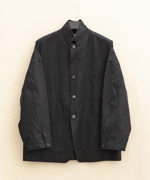 YOKO SAKAMOTOユニセックスブランドとして展開。ブランドコンセプトはシーズン毎に敢えて設けず、「日常着」として常に身につけたくなるプロダクトを提案。また、女性デザイナーが作り出すメンズウェアという独自の空気感にもこだわったモノづくりを行っている。------------------------------------------------------立ち襟としても着用できるワークジャケット。普遍的なワークジャケットのスタイルをルーズなシルエットにアレンジされた一枚。襟は気軽に立ててクシャクシャに着て頂いても素敵です。製品洗いを施しているので、着古したかの様なクタッとしたシワの入った風合いが魅力的。オールシーズン活躍できる丁度良い生地感でフロントポケット・胸ポケット・内ポケット付きです。