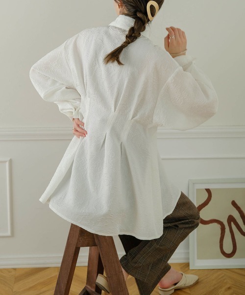 ●Bab●■POINT柔らかいジャガード素材が素敵なシャツブラウス。ウエストにタックが入っているのでスタイルアップも叶います。裾広がりのシルエットや歩くとなびく裾の軽やかさも女性らしさを演出してくれます。■FABRIC凹凸感が特徴的なブラウスです。立体的な柄は、シンプルなボトムスと合わせても着映える素材になっています。■COORDINATEボタンをすべて留めて着るのもよし、前ボタンを開けて羽織として使用するにも便利なアイテムです。ジャンパースカートの中にも着ていただける厚み感になっています。…………………透け感:オフホワイトのみ淡色のインナーの着用をおすすめします。裏地:なし…………………※撮影環境により、多少実際のカラーと異なる場合がございます。また、携帯やスマートフォン、パソコンなどの画面上と実物では多少色が異なって見える場合がございます。ご了承下さいませ。※画像の商品はサンプルのため、実際の商品と若干仕様が異なる場合がございます。(必要であれば入力)※濃色品は、過度な摩擦や濡れた状態での摩擦により、色落ち・色移りをする恐れがあります。※この商品は、素材の特性上、洗濯の際に多少の縮みが生じる恐れがあります。洗濯後は形を整えてから干してください。※その他お取り扱いに関しましては、商品に付属のアテンションタグをご覧ください。★商品のお気に入り登録再入荷やラスト1点のお知らせ、セール情報などお知らせを受け取ることができます!★ブランドのお気に入り登録新商品や再入荷などのお得な情報を受け取ることができますので、是非ご登録ください。