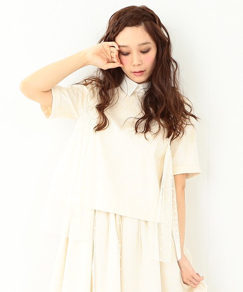 クラシカルな印象の大人ガーリーなトップスです。しっかりとしたボディにふんわり広がるチュールのコンビが新鮮。さりげないジャカードで大人っぽさを、チュールにはドットフロッキーを施し愛らしさをプラスしました。 テーパードパンツに合わせればちょっぴり甘さ控えめに。思いっきりキュートに決めたい日はスカートコーデがおすすめです☆ 品番:62-01-0001-923