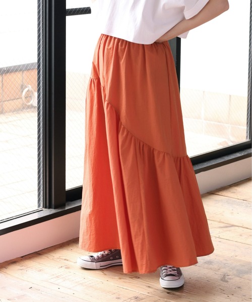 360℃好きな位置で着られる!古着のような雰囲気のロングスカート ◇Point◇ アシンメトリーなデザインの切り替えがポイント。 360℃向きを変えて着用できるマルチWAY仕様なので、気分やトップスに合わせてお好みのデザインが楽しめます! シャカシャカして素材とボリューム感のあるロングスカートで、スポーティーミックスコーデに! ◇Material◇ ナイロン素材で、シャカシャカとした生地です。比較的マットな見え方になっています。 ご自宅での手洗いが可能です。ウエストはゴム仕様で楽ちんです。ポケットはありません。 ◇Coordinate◇ コンパクト目なTシャツやニットをインする着こなしか、ゆるっとしたサイズ感のスウェットやニットをたっぽりと着るのがおすすめ〇 足元はスニーカーやブーツがよく合います! ※照明や天候により実際の色味と異なって見える場合がございます。ご了承くださいませ。