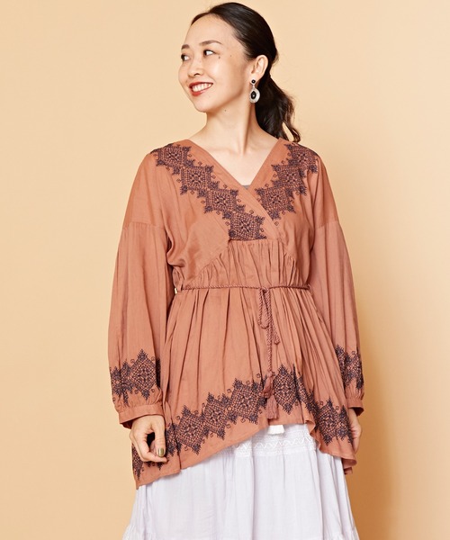 --- Gypsy Embroidery Tops --- ジプシーのように自由に。 袖を通せば、吹き抜ける風が心地良い。 ジプシーの自由な生き様や熱情を表現したトップス。 どこかレトロな雰囲気を感じさせる、繊細な刺繍と色合い、ふわりとしたボリューム袖で華やかな雰囲気を演出。 首元は女性らしさを引き立てるカシュクールタイプ。ハイネックトップスと合わせていただくのもおすすめです。 ウエストのタッセル付きコードは前で結んでも、後ろで結んでも◎取り外しも可能ですのでお好みで楽しめます。 薄手の生地感で秋コーデにおすすめ◎リゾート感のあるスタイルで自然に身を任せ、心を解放しよう。 ※こちらの商品は1点1点職人による手作りとなります。その為、形や色合い・模様など若干異なる場合がございます。あらかじめご了承ください。 ※屋外での撮影画像は、光の当たり具合で色味・カラーが違って見える場合がございます。商品のカラーは、スタジオ撮影の画像をご参照ください。 Amina Collection Co.,LTD.