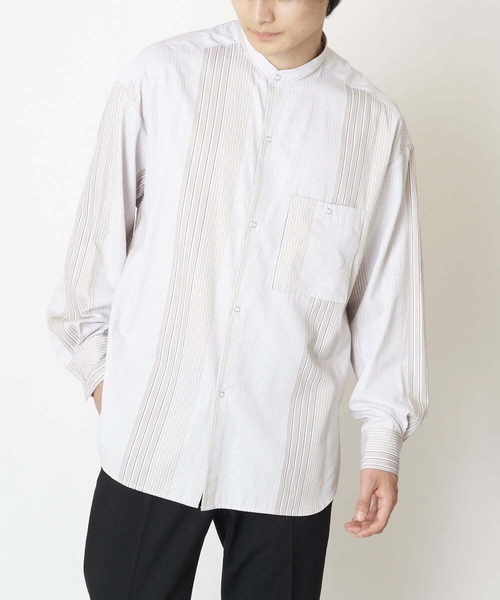 ◆今季トレンド!リングドットボタンがアクセントになっているBIGシャツ。◆【デザイン】上品顔のトレンドオーバーサイズシャツ。ランダムストライプ柄でインパクトのある一枚。ワイドシルエット・ロング丈で裾デザインは前身はラウンド、後身はスクエアになっており、重ね着した際の裾変化も楽しめるデザインです。リングドットボタンを使用しており着脱も便利で程良いアクセントになっています。今季らしいシルエットバランスのシャツのため、取り入れるだけでおしゃれ度がアップするトレンドアイテムです。【素材】表情豊かなランダムストライプ。程よくハリ感のあるポリエステルコットン素材を使用。イージーケア、ご自宅で洗濯機洗いができるためデイリーユースに着用できるのも嬉しいポイントです。【スタイリング】一枚で着ても羽織りとしてもサマになる一着です。冬にはニットのインナーに来たレイヤードアイテムとしても着用可能です。ボトムはきれい目スタイルであればスラックス合わせ、カジュアルスタイルであればゆとりのあるパンツとあわせるとバランスが良いコーディネートの完成です。----------------透け感:なし裏地:なし伸縮性:なし光沢感:ややあり生地の厚さ:普通----------------≪お気に入り登録機能の使い方≫■商品のお気に入り登録(ハートマークをクリック)再入荷通知や値下げ等、お得なご案内を受けることができます。----------------※44/S 50/XLサイズはWEB限定販売です。※生地の裁断により、柄の出方や繋ぎ目が画像と異なる場合がございます。 ご指定は出来ませんので予めご了承下さい。※お使いの液晶環境により、色味が多少異なる場合がございます。予めご了承ください。※サンプルにて撮影しておりますため、お届けの商品と仕様が若干異なる場合がございます。予めご了承ください。
