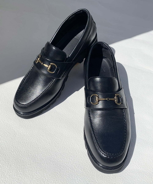 フェイクレザー素材のビットローファー。マットな表情のフェイクレザーを使用することで、落ち着いた印象に仕上げています。ゴールドのビットがポイントです。重さを感じさせないシューズで履き心地もよく、カジュアルからきれいめスタイルまで幅広いシーンで着用して頂けます。