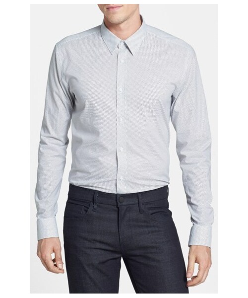 A lean silhouette and allover arrow print enhance the modern appeal of a crisp, point-collar sport shirt cut from lightweight cotton. 31" length; 41" chest (size Medium). Raised placket. Mitered, adjustable-button cuffs. Back yoke. 100% cotton. Machine wash warm, line dry. By Hugo Boss; imported. Men's Sportswear. Learn more about the Hugo Boss labels.