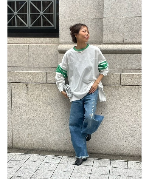 ulu original ラグランロングスリーブTシャツbigsilhouetteがかわいいシルエット。カジュアルにゆるっと着用していただきたい1着です。裾にかけてやや広がりのあるラインで小さめさんがチュニックワンピのようにスキニーなど合わせていただくのもかわいいです。お袖はあえて長めのややドルマンシルエットです。お袖とネックラインに入った配色がポイントで、シンプルなブラック、vintagelikeなグリーン、どちらも大人カジュアルコーデに取り入れやすくおすすめ。