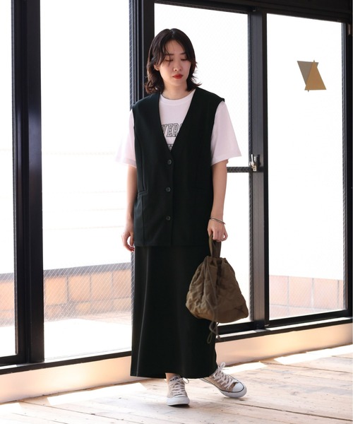 手軽に決まる、ベストとスカートがセットになった、セットアップアイテム◇Point◇1着でコーデが決まる、ベストとスカートのセットアップアイテムです。シンプルなデザインで、別々でも着用でき着回し力抜群のセットアップです。落ち着いたカラーなので、半袖と合わせても秋らしい雰囲気で季節の変わり目から大活躍します。◇Material◇肌当たりがさらりとしたストレッチ素材のカットソーなのでリラクシーな印象です。ブラック・カーキの落ち着いた色味なので、透け感はほとんど気になりません。スカートはポケットなし、ベストはポケットあり。ご自宅での手洗いが可能です。◇Coordinate◇Tシャツやシアーインナー、ハイネックニットなどをインナーに着るのがおすすめ。ベストはカチッとした雰囲気のデザインで、ボトムにはデニムやチノパンなどカジュアルなテイストのアイテムがよく合います。スカートはシンプルなタイトめのデザインでどんなトップスにも万能に合わせていただけます。※照明や天候により実際の色味と異なって見える場合がございます。ご了承くださいませ。
