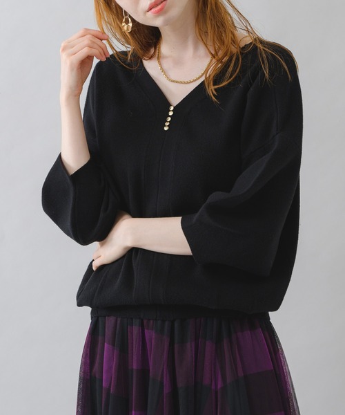 前後2WAYでお召いただけるシンプルぽわん袖ニットプルオーバー。○POINT・前後2WAYでお召いただけます。・片面にはメタリックなシャンパンカラーの釦が配されており、シンプルながらもアクセントに。・これからの乾燥するシーズンに嬉しい静電気防止素材を使用しています。・裾にはタックが配されており、コンパクトなシルエットに仕上がっています。○STYLING・シンプルなデザインのニットなので、ボトムスは無地はもちろん、柄ものと合わせても◎裏地:なし光沢:なし伸縮性:あり透け感:なし生地の厚さ:普通ポケット:なし