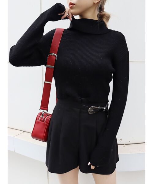 しっかりとした厚みのあるリブ素材で作ったショート丈のタートルネックニットトップスです。クロップド丈でハイウエストのボトムとも相性がいい一枚。ゆったりとしたボリュームのあるタートルネックもポイントとなっています。