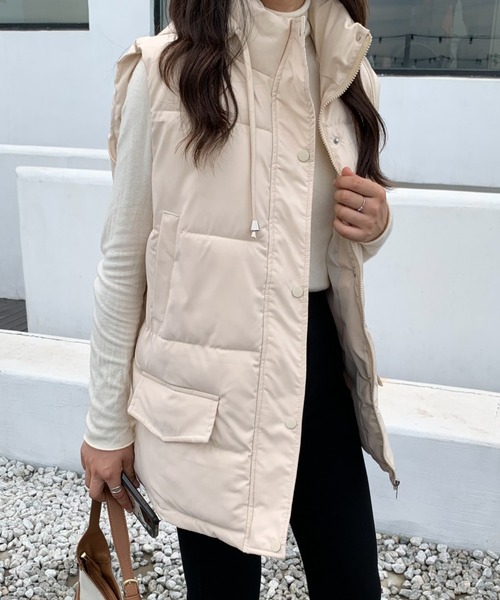 1枚羽織るだけでこなれた印象に魅せてくれるフードベストデザイン♪秋冬コーデに欠かせない、一枚あると便利な中綿ベストが登場! 暖かく軽い着心地で一枚羽織るだけで今年らしいトレンドスタイルに ボリューミーなのに軽くて、風を通さず暖かいフェイクダウンベストです。 お尻回りまで隠れる少し長めのデザインで、暖かさはもちろん大人っぽい印象に スタイリング カジュアルスタイルの上にさらっと合わせるだけで、旬なスタイリングが完成。 デニムパンツはもちろん、スウェットパンツにも好相性◎ スタンドハイネックなので、スッキリとしたインナーを合わせると、モードカジュアルなスタイルにキマリます。 【お買い物をより楽しんで頂くために】 ▼商品のお気に入り登録 ♡のクリックで商品のお気に入り登録が完了! 完売カラー再入荷のお知らせ、ラスト1点のお知らせ、セールのお知らせを受け取ることができます。 ▼ブランドのお気に入り登録新商品や再入荷のお知らせ等、いち早くブランドのお得な情報を受け取ることができます。 ※他のキャンペーンにより、期間中に価格が変動する場合があります。 ※セールは予告なく終了させていただく場合もあります。 ※商品画像は撮影時の光や角度により、実物の色味と異なって見える場合がございます。 ※生産時期により色・素材・サイズ感など多少異なる場合がございます。予めご了承ください。 ※画像の商品はサンプルとなります。 実際の商品と色味、仕様、加工、サイズ、素材等が若干異なる場合がございます。 ※サイトに表示されているカラー名と実際のお届け商品に記載されているカラー名が異なる場合がございます。 ●サイズ表をご確認の上、お間違いのないようご購入下さい。 ※サイズは平置きで測定しております。 サイズは、実寸サイズを測っているため多少誤差がでる場合があります。 製造工程の関係上、各採寸箇所実寸(平置き)より【約-2cm~+2cm】程度は 誤差の許容範囲とさせて頂いておりますので、予めご了承くださいませ。