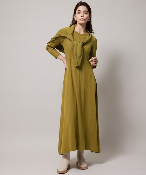 【素材】 レンチング社の環境に配慮したレーヨンECOVERO(TM)をポリエステルと混紡した糸を使用しています。適度なツヤがあり、ピリングにもなりにくく長いシーズンお使いいただける素材感です。 【デザイン・シルエット】 身頃がランダムリブ、スカート部分が天竺というニットならではのテクニックを用いたワンピース。トップはフィットしてスカート部分に綺麗なフレアーが出ます。ニットならではのコンフォートな着心地でありながらエレガントな印象のワンピースです。 【カラー】 コートのインナーにも映えるマスタードとブラックの2色展開 【おすすめのスタイリング】 1枚でさらっと着るのも素敵ですが、ジャケットやマウンテンパーカーのインナーにも〇。素材感やテイストの違うアイテムを合わせることでスタイリングの幅が広がります。 ※ECOVERO(TM)とはパルプを原料とした再生繊維で、水汚染、CO2排出量を一般的なレーヨンと比べ50%削減できる環境に配慮された糸であり、Lenzing AGの商標です。 ---------------------------- 透け感:なし 裏地:なし 伸縮性:あり 光沢感:なし 生地の厚さ:薄手 ポケット:なし 洗濯方法:手洗い可能 ---------------------------- 【モデル情報】 モデル身長:171cm着用サイズ:38 ※画像の商品はサンプルです。 実際の商品と仕様、加工、サイズが異なる場合がございます。 ※撮影場所やライティング、お使いのモニター環境によって色の見え方が異なる場合がございます。 ※商品のカラーは画像の色味をご参照ください。動画は仕様説明のため、色味が実物と異なる場合がございます。