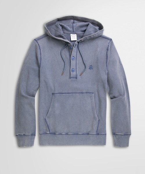 ストレッチの効いたコットン素材を使用したフーディー表面の凹凸が特徴的な肌触りの良いワッフル生地を用いました。フロントにはカジュアル感がアップするカンガルーポケットを付け、左胸にGF(ゴールデンフリース)マークの刺繍を施しました。