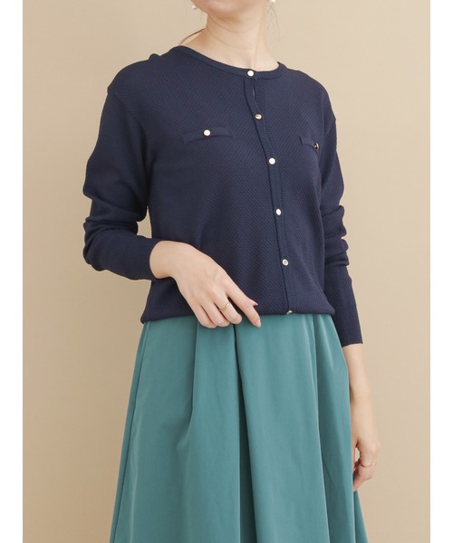 胸元のポケットがエレガントな雰囲気を放つカーディガン。ドット柄のような透け感のある生地が、季節の変わり目にぴったり◎クルーネックのデザインでカジュアルに着こなせるのもポイント。スカートと合わせて上品なコーディネートを楽しめるアイテムです。※商品画像は、撮影環境やお客様のご利用のPC・スマートフォンの モニター環境などにより実物と色味に差異がある場合がございます。