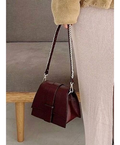 リザードライクな生地を使用した高級感溢れるハンドバッグ ▽Point▽ バッグ自体はとてもシンプルな造りですが、 角をつくり高見えするデザインに仕上げました。 ショルダー部分には少し大きめのチェーンを付けトレンド感あるハンドバッグに。 コンパクトですがデザイン性もあり、コーデに合わせやすいバッグです♪