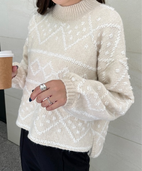 【StyleSea】芦屋発ブランド「スタイルシー」。シンプルで気負いのないシルエット、リラックススタイルで、流行に左右されないタイムレスなデザイン。着心地に拘り、リラックスと都会的な間を楽しむ、女性らしさを忘れないライフスタイルブランド。Autumn/Winter Collection【Design/Fabric】■立体感のあるジャガードが特徴のモックネックニット珍しい大ぶりのダイヤ柄の立体ジャガードのハイネックの大人ガーリーなニットトップス。控えめなボリュームスリーブとモックネックが可愛らしさをプラスしてくれます。上からアウターを着てもすっきり着れる、ほどよいフィット感の大人かわいい印象にしてくれるニットプルオーバーです。■気になる「デコルテ」「ウエスト」をカバー襟元は苦しくなりにくいモックネックで首元もすっきり。長すぎず短すぎない着丈はウエストもさりげなくカバー。アウターにもひびきにくいフィット感で、ボトムスも選ばないミドル丈セーターです。■体型カバーポイント【デコルテ】【二の腕】【ウエスト】【スタイリング】・フレアスカートやスラックスなどと相性がよく、様々なコーデに組み立てできるアイテムです。・バラクラバとあわせて旬の韓国トレンドファッションにも◎・センターシームデニムやワイドパンツと合わせてオフィスカジュアルスタイルにもオススメです。・マーメイドスカートやタイトロングスリットスカート合わせれば大人っぽくこなれ感のあるスタイルに。・ファーブルゾンやボアジャケット、ミリタリーコートやモッズコートなどのボリュームアウターとの合わせると季節感のある旬のコーデに。・バケットハットなどの小物、スクエアバッグ、鍵編みアイテムやスマホショルダー、足元はニーハイブーツ、トレンドのサイドゴアブーツやショートブーツ、スニーカーやスクエアトゥパンプスなど、小物次第で、自由にムードチェンジができるので、飽きがこず長くご愛用いただけます。・ルームウェアやワンマイルウェアとしてはもちろん、これから旅行やレジャーにも使えるアイテムです。・アームカバーやアームウォーマーニットと合わせてトレンドコーデにランクアップ。【生地】――透け感:なし厚さ:普通伸縮性:あり――――――― ―――お取り扱い上のご注意―――[色味・サイズについて]ご覧のモニター環境や撮影環境(光の照射や角度)により、実際の商品と多少色味が異なって見える場合がございます。また商品画像はサンプルのため、稀にサイズ変更がある場合がございます。予めご了承くださいませ。[シワについて]発送上の状態によって商品がシワになる場合がございます。[においについて]密封状態で入庫し、検品時に再度袋詰めを行っておりますが、素材により染料等の臭いが若干残っている場合がございます。使用していくと臭いが抜けていくのでご安心下さいませ。[色落ちについて]商品により色落ち・色移りがある場合がございます。品質表示を必ずご確認のうえ、着用、お洗濯、保管をお願い致します。《『♡』マークを押してお気に入り登録でお得な情報がたくさんゲット♡》―――――商品のお気に入り登録―――――★ラスト1点のお知らせ ★再入荷 ★セール ★クーポン対象 ★お気に入りの商品コーディネートなど様々な通知をお知らせいたします。――――ブランドのお気に入り登録――――【新作商品】【再販商品】など、お得な情報を受け取ることができます♪是非ともお気に入り登録をお願い致します。