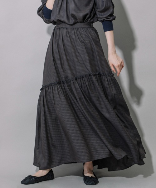 □2022 AUTUMN & WINTER COLLECTION□◆落ち感があって大人っぽい滑らかでしなやかなレーヨンビエラのティアードマキシスカート◆<MATERIAL>レーヨン糸にポリエステル糸をダブルカバーしたウォッシャブルレーヨン素材です。一般的にレーヨンはやわらかく着心地の良い素材ですが、洗濯で縮みやすくシワになりやすいデメリットがあります。この素材はポリエステルを抱き合わせることで、風合いの良さを保ちつつ、家庭で洗えるように仕上げています。レーヨンならではのしなやかでなめらかな雰囲気がしっかりと出ています。ギャザーをたっぷり寄せても軽やかで着心地抜群なのを生かし、今回は女性らしさのあるデザインのブラウスとスカートを用意しました。<MATERIAL>穿いた時に動きが出るのがポイントで、切り替えの位置や、スカートの丈がさりげなく左右で違っているアシンメトリーなティアードスカートです。昨年21SS2ndのスカート(MN211S48)を、なめらかなレーヨンポリエステル素材でアレンジしました。たっぷりとギャザーを取っていますが、甘くなり過ぎずに着られるよう、ボリュームを控え目にし、落ち感のきれいな素材に乗せることで、より大人っぽい雰囲気で仕上がっています。全体的に長めの丈感もポイントです。ベージュ・ネイビーは細かなチェック柄になっており、シンプルなトップスを合わせるだけでコーディネートが完成するアイテムになっています。同素材のMN222T30のブラウスとセットアップでワンピースの様なコーデもおすすめです。<COLOR>■ブラック(無地):深みのあるブラック。どんなコーディネートにも合わせやすい定番カラーです。■ベージュ(チェック):ライトベージュをベースにしたネイビーブルー、ボルドー、マスタードのチェック柄。女性らしいやわらかなニュアンスのあるカラーです。■ネイビー(チェック):深いネイビーをベースにしたグリーン・パープル・オレンジベージュのチェック柄。 秋冬シーズンらしい色味でまとめたシックなカラーです。<SIZE>■普通体型157cmのスタッフはXSサイズを着用しています。■普通体型160cmのスタッフはSサイズを着用しています。■165cm以上でもやせ形の方はSサイズで問題なく穿けますが、骨盤がはっていたり、長めの丈感がお好みの方はMサイズをおすすめします。※ウエストは3cmずつ大きくなり、丈は2cmずつ長くなります。※光のあたり具合いやパソコンなどのモニター環境によって実際の色味と異なって見える場合がございますので、予めご了承ください。※着用商品はサンプルです。サイズ等の仕様に若干の変更がある場合がございますので、予めご了承ください。*お取扱いについては、商品についております品質表示、アテンションタグにてご確認ください。洗濯:手洗い可.............................≪INFORMATION ≫............................▼商品のお気に入り登録▼『♡』マークを押してお気に入り登録して頂いた商品は、セール開催の通知やクーポン発行などのキャンペーンなど、お得な情報をいち早く受けとる事が出来ますので、ぜひご登録ください。