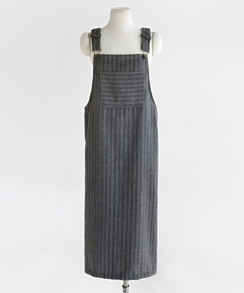 ストライプパターンのロングサロペットスカート。 レイヤードにぴったりのアイテムです。 ゆったりとおちるストレートフィット。後ろ側には長くスリットが入っています。 前と後ろのポケット部分はボーダーになっています。