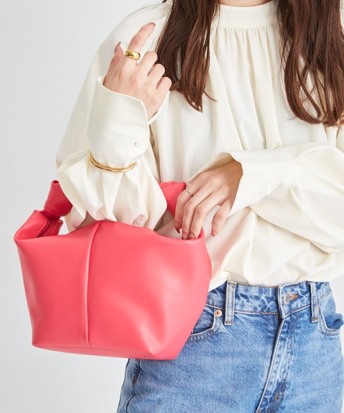 【Shelly island /シェリーアイランド】 Shelly island 2022SS 新色カラーで再登場! コロンとした台形フォルムが上品で可愛いハンドバッグ《detail》・ハンドル部分の結び目がトレンド感あるアイテム。・マチが設けられ、コンパクトながらしっかりと荷物が収納できます。 500㎖のペットボトルが寝かしで入る大きさです。 小さすぎないサイズ感なので使いやすく貴重品もしっかり収納できます。・口が大きく開くので荷物の出し入れがしやすいのもポイント!・内側面にはファスナー付きポケットがあり、ちょっとした小物を入れるのに◎・ベーシックからトレンドまで幅広い着こなしを楽しめるアイテムです。《fabric》 軽量で柔らかなフェイクレザー※生産時期により裏地の色が異なります。 ※生産時期により若干の色ブレやサイズの変動が生じる場合がございます。◆商品のお気に入り登録完売カラーの再入荷通知、残り1点の通知、セール等値下げした時の通知も受け取ることができます。◆ブランドのお気に入り登録新商品や再入荷など、いち早くブランドのお得な情報を受け取ることができます。是非ご活用ください。※この商品は、摩擦や、汗・雨などによる水ぬれにより色落ちが生じる場合がございます。衣服や周囲のものに色移りする恐れがありますので、白色や淡色のものと組み合わせる際は、十分にご注意ください。※撮影環境により多少実際のカラーと異なる場合がございます。※生産時期により若干の色ブレやサイズの変動が生じる場合がございます。※表示のサイズ感と実物は異なる場合もございます。※この商品は、合成皮革を使用しています。素材の特性上、空気中の湿気や紫外線、熱や汚れなどにより、時間の経過と共に劣化(剥離・べたつき)します。上記ご了承の上、お買い求め下さいませ。