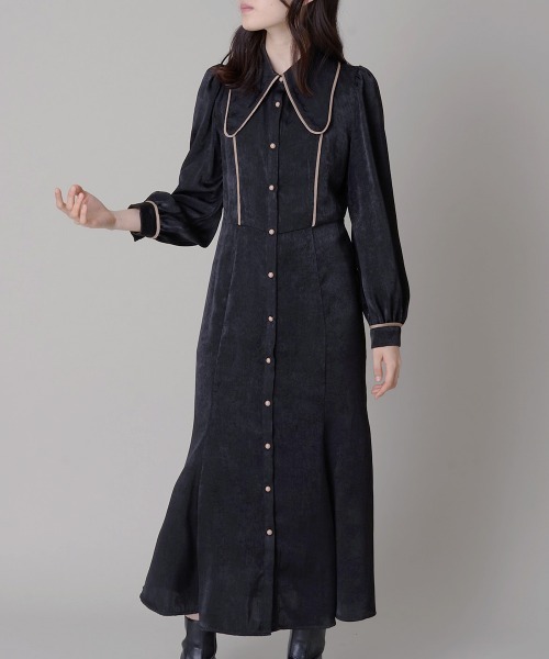 ◆光沢感あるサテン生地ワンピース◆■デザインビンテージサテン生地のワンピース。配色のキノコボタンが可愛らしく目を引きます。袖部分は配色のパイピングを施しています。大きめの襟もポイントで、周りと被らずデザイン性も◎マーメイドシルエットでスタイルアップ効果も抜群です。■着用感サテン素材特有のツルっとした素材感が肌触りに心地よく、ノンストレスです。大きな襟にパイピングが施され 、メリハリがついていることにより顔周りをすっきりと映してくれます。【156㎝ 標準体型】…………………… 透け感:なし 厚さ:普通 伸縮性:なし 洗濯方法:家庭洗濯可 …………………… ≪お気に入り登録機能の使い方≫ ■商品のお気に入り登録(ハートマークをクリック) 再入荷通知や値下げ等、お得なご案内を受けることができます。