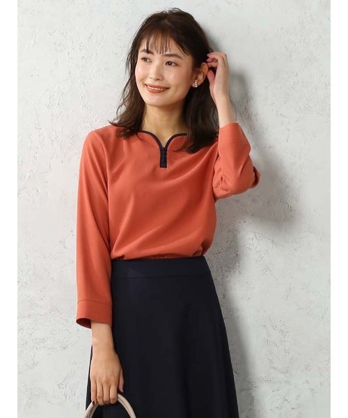 襟ぐりカラーパイピングと配色クルミボタンがお洒落なデザインポイントのブラウス。着こなしにさりげないアクセントを与えてくれるスタイリッシュなデザインが魅力。パンツと合わせて配色バイカラーセットアップも楽しめます。シーズン問わず着こなしやすい8分丈の袖もポイントです。 ○商品の特徴 ・秋冬まで着られる少し肉感のあるジョーゼット生地 ・ナチュラルストレッチ ・シワになりにくい ・配色部分と同じネイビーを使用したパンツとの組み合わせが◎ ◆モデルサイズ:身長164cm 胸囲80cm ウエスト59cm ヒップ87cm ◆着用サイズ:9号(M)【商品のお気に入り登録がおすすめです】 お気に入り登録した商品は、最後の1点の通知、完売商品の再入荷、お得なお値下げ時にお知らせします。 【Perfect Suit FActory/P.S.FAのお気に入り登録がおすすめです】 PSFA新商品発売、再入荷や、セール情報など、お得なショップ情報を受け取ることができます。