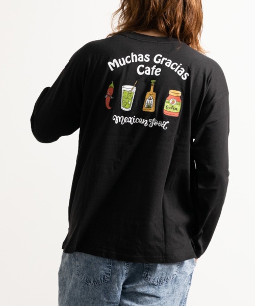 ベーシックデザインのバックプリント ビッグシルエット 長袖Tシャツ。●1枚での着用から、重ね着での着用まで幅広い活躍の定番デザインのカットソー●生地は適度に薄手のインナーに適したコットン生地●フロントにはロゴプリント、バックにはイラストのプリント●シルエットルーズなフィット感のビッグシルエット【カラー】ブラック、ホワイト、カーキの3色。