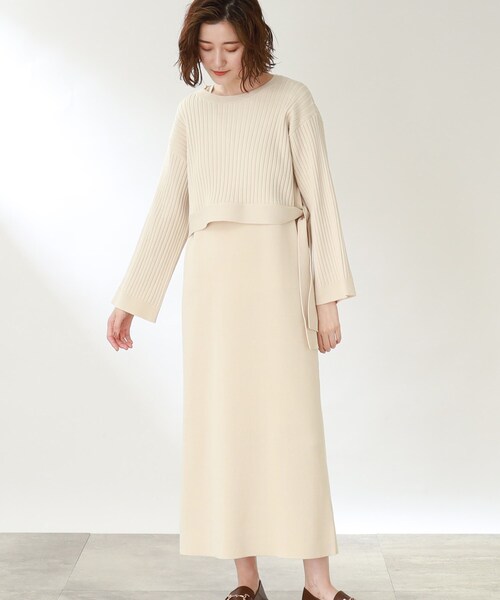 ■POINT/Detail ナローシルエットのワンピースとクロップド丈でゆったりとしたサイズ感のバランスがかわいいセットワンピース。 同素材でのセットになりますが、編地を変えることでメリハリのあるデザインに。 サイドのリボンは結んだり、そのままルーズに垂らしてもかわいいディテイールになっています。 ※ポケットなし ■Fablic/Function コットン(綿)混でシーズンレスで着用できる素材感。 トップスは大幅のリブ編みで表面感のある素材で作成。 ワンピースは体のラインをひろいにくい肉感のある総針編みで作成しています。 ※裏地なし ※ライトベージュ(051)は透け感があるため、インナーの着用をおすすめします。 ■Cordinate 一枚で様になるセットのデザインワンピース。 それぞれセパレートでも楽しめるお得なアイテムです。 こちらの商品は主に秋に着用いただける商品です。 モデル情報:身長166cm B80 W59 H86 着用サイズ:12(M) 店舗へのお問い合わせ商品番号:040-55015 ●製品寸法: 12(M):プルオーバー着丈41cm プルオーバーB94cm プルオーバー袖丈45cm プルオーバー肩幅41cm ワンピース着丈122cm ワンピースB90cm ワンピース肩幅35cm ワンピースW92cm ワンピースH96cm 13(L):プルオーバー着丈42cm プルオーバーB96cm プルオーバー袖丈46cm プルオーバー肩幅41cm ワンピース着丈126cm ワンピースB94cmワンピース 肩幅35cm ワンピースW94cm ワンピースH98cm 備考: