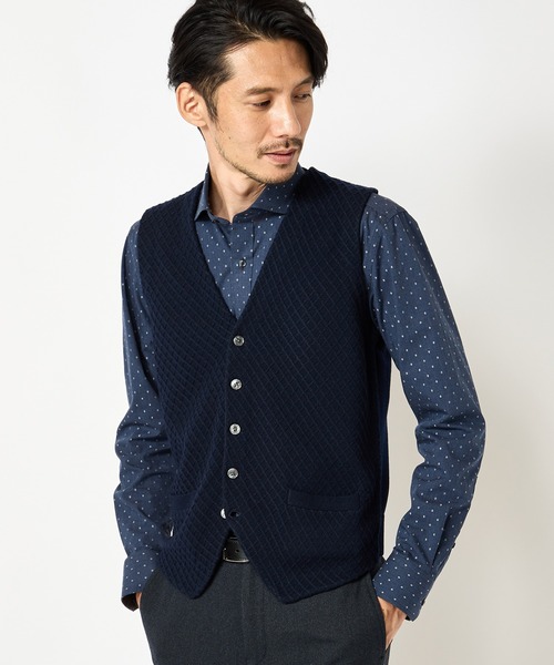 着回し力抜群!ビジカジ兼用ニットベスト 【デザイン/素材】 CROWDED CLOSET今季のテーマである「MIX AND MATCH」という、 着回しワードロープを意識したアーガイル風のダイヤジャガードを前身頃に採用したハイゲージニット。 前ボタンのニットベストでコーディネートのアクセントにも。 ラフすぎないデザインがビジネスシーンにマッチ。 糸はカシミヤタッチのヌメ感ある風合い。滑らかで手触りが良く、高級感のある仕上がりです。 袖と後ろ身頃は天竺編みとなっておりヨコの伸縮性に優れているため、ジャケットの下に着ても、重ね着しても着ぶくれしない薄さ。 ビジカジ用のインナーだけでは寂しいときや、温度調節の一枚としても重宝します。 【スタイリング/シュチュエーション】 前身頃のダイヤジャガードがどんなコーディネートにもマッチ。ビジカジ兼用でお使いいただけますので、ジャケットスタイルにもシャツスタイルにもマッチ。 素材感のあるウールライクパンツや、スェードパンツなどとも好相性。どんなジャケットとも相性が良く、秋冬ヘビロテ間違いなし。 落ち着いた雰囲気を演出してくれます。 ニットベストのほか、こちらもビジカジ兼用で重宝するVネックニットや、よりカジュアルにご着用頂けるタートルネックもございます。 Vネック 商品名:12Gダイヤジャガード Vネックハイゲージニット 品番:M0123KSW601 タートルネック 商品名:12Gダイヤジャガード ハイゲージタートルネック 品番:M0123KSW602 【着用モデル情報】 身長186cmバスト88cm ウエスト73cm ヒップ92cm 着用サイズ:03(L) 【CROWDED CLOSET(クラウデッド クローゼット)】 MEN'S BIGIのスーツレーベル。 確かなもの作りを基本に、ファッション性と機能性を備えた高品質なスーツスタイルを手ごろな価格で。変わりゆくライフスタイルに合わせてテーラリングされたビジカジウェアをご提供いたします。 ※サンプルでの撮影の為、実際の商品とデザインが多少異なる場合がございます。 ※生地や仕様・デザインにより、着用感が異なる場合がございます。 ※モニター・パソコン環境により色味に誤差が生じる場合がございます。予めご了承くださいませ。