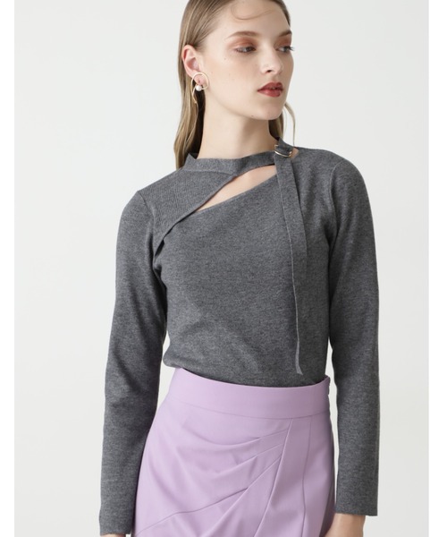 胸元のカッティングでヘルシーな肌見せが叶うニットプルオーバー。アシンメトリーなカットがシャープな印象を与えます。モックネックのDカンが、首元にアクセントをプラス。アジャスター機能もあるので首回りの調節が可能です。 身体に程よくフィットしたシルエットですが、身頃と袖は総針ですっきりとしており、肉感は拾いにくい作りです。胸上のパーツのみリブで、さり気なく編地に変化を付けました。様々なボトムに合わせやすいデザインニットです。 【素材説明】 適度なストレッチで着心地の良さが特徴です。形態回復性と柔らかさを併せ持つ特殊素材をブレンドした糸を使用しています。 【商品特性】 ストレッチ性有り/かぶって着用/ネックにDカンアジャスター付き