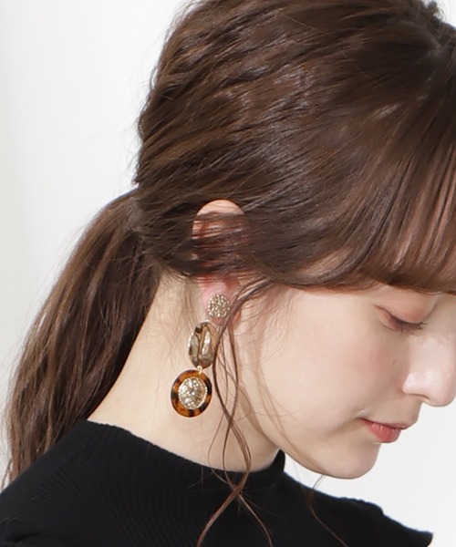 耳もとで揺れるフェミニンなイヤリングべっ甲風の樹脂にゴールドのパーツを合わせたIラインのデザインです。ゴールドのメダルパーツとイレギュラーなパーツのMIX感が魅力。コーディネートになじみのいいアクセサリーです。