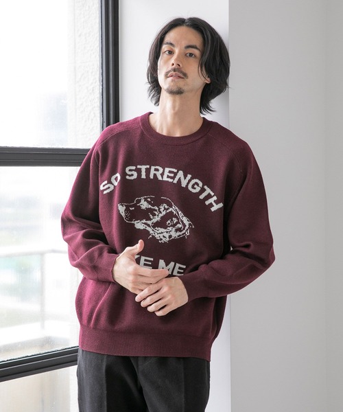 立体感のあるデザインを楽しめるアイテム フロントに大胆に施された犬の顔がポイントのニットプルオーバー。 ジャカード編みにすることで、繊細な犬の表情を表現できています◎ 今季定番のカレッジデザインもニットで表現することで落ち着いた雰囲気に仕上げました。 カラーに合わせて、ゴールデンレトリバー・ボストンテリア・ブルドッグの3種類をアソートで展開。 ※屋外の光や照明の当たり具合で、実際の商品の色味とカラー別画像の色味に違いが発生する場合がございます。商品の色味はスタジオ撮影の詳細画像にてご確認ください。