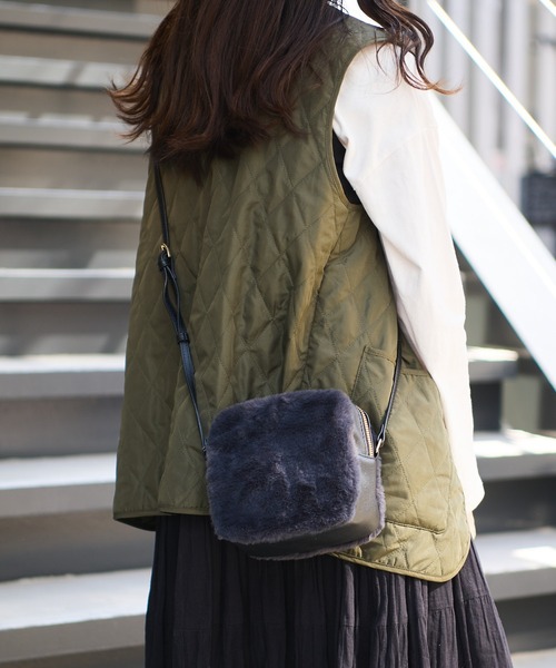 女性らしいファー素材に、ころんとしたキューブの形を合わせたショルダーバッグ。 ダブルジップファスナーで、中は両面ポケットの仕様です。 シンプルながら存在感のあるデザインで、コーディネートのポイントにおすすめのアイテムです。 サイズ:幅15×奥行8×高さ14cm (持ち手の長さ112~125cm) *内ポケット×2
