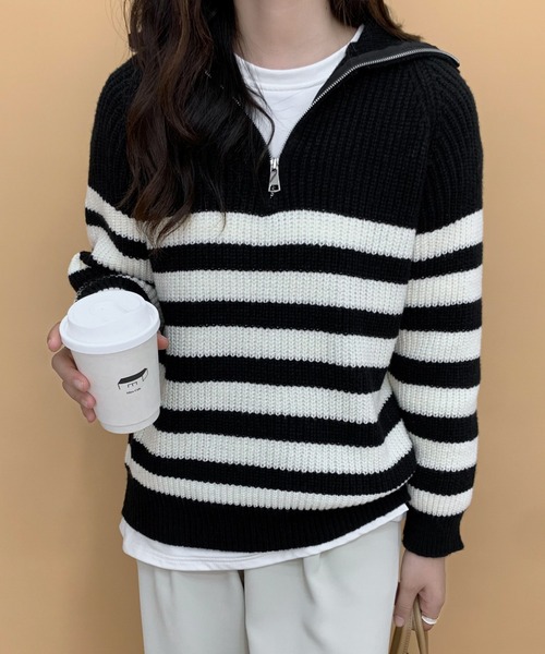 トレンドのハーフジップ×ボーダーが着映える! 新作ニット・プルオーバーが新登場です。 首元のジップ仕様は、暖かなハイネックとして着たり、 衿元を思いきり開けて抜け感を出したり。 気候や気分、シーンに合わせてお好みのアレンジを 楽しめる着まわしデザインです。 程よくゆったりとしたサイジングに、 こなれ感のあるサイドスリットや、ヒップが隠れる丈感も◎ 長袖のビッグTやブラウスなどに合わせた レイヤードコーデも今年らしくてオススメです! ▼お気に入り登録のおすすめ 【気になるアイテムを登録】 ハートをクリックしてお気に入りに登録すると 完売カラーの再入荷やラスト1点の通知、セールの通知を受けとることができます。 【ブランドを登録】 新商品や再入荷、セール通知など、いち早くブランドの情報を受けとることができます。是非ご利用頂き、お買い物をお楽しみ下さい。 ▼商品について ・サイト上のカラー名と、お届け商品に記載されているカラー名が異なる場合がございます。 ・商品の色味は、撮影場所や光のあたり具合などにより色味が違って見える場合がございます 。また、お客様のお使いのPCのモニター環境などにより色味が違って見える場合がございます。 予めご了承の上ご注文下さい。