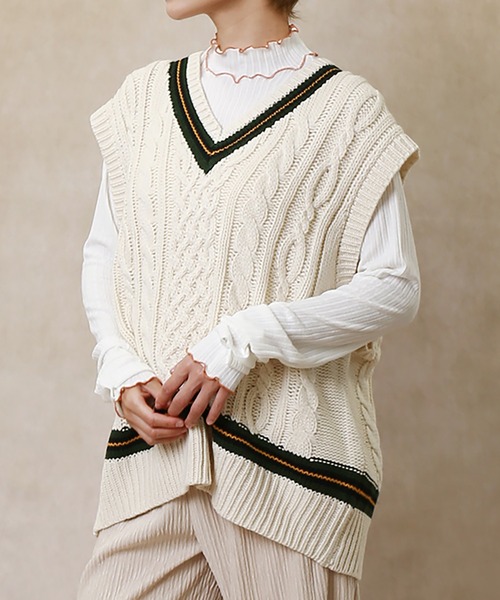 【トレンドベストはニットでも!配色が可愛いニットベスト】 ▼おすすめポイント 1.深めなVネックがレイヤードスタイルを更に楽しくなる一着。 配色デザインが可愛く、暗くなりがちな秋冬コーデも明るくしてくれます。 2.トレンド感のあるチルデンニットで、ヒップがすっぽりと隠れるオーバーシルエットが魅力なデザインです。 ケーブル編みが可愛く、いろんなテイストと相性が良いアイテムです。 3.レトロな配色で、古着MIXコーデにも相性抜群です! ▼おすすめのStyling 1.ミニボトムと相性抜群な丈感なので、ビッグTとロングブーツを合わせてプレッピースタイルに。 2.ボリュームはないのでスカートやワンピースと合わせてもスタイリッシュに。 3.秋口もあえてノースリーブで合わせて、アームカバーをして最旬スタイリングに! ※スタイリングは、詳細画像のコーディネートでご覧ください ▼担当からひと言 1.トレンドのベストは、ニットで持っていても◎例年とは違ったスタイルが楽しめます。 2.豊富なカラー展開は、秋冬の差し色におすすめです♪ ----------------------------------- 透け感:無し 厚さ:普通 伸縮性:あり 洗濯方法:ドライクリーニング可能 ----------------------------------- ※詳しいお手入れ方法は、商品タグをご確認ください。 ※素材の性質上引っ掛かりが生じやすいため、着用・着脱の際はアクセサリー等の突起物にご注意下さい。 ▼お悩みの方に ------------------------------ 〇アイテムのお気に入り登録 気になっているアイテムの色、サイズの♡をクリックして、ラスト1点を通知でお知らせします 欲しかったアイテムの♡をクリックすると再入荷の通知でお知らせします。 ------------------------------ 〇ショップのお気に入り登録 ショップページの♡をクリックすると、新商品、人気アイテムの再入荷など、お得な情報を受け取ることができます。 ------------------------------ ▼注意点 ※掲載画像(商品、モデル着用とも)につきまして、撮影環境やお客様の閲覧されますパソコンや携帯電話キャリアによって、実際の商品とは多少異なった色に見える場合があります。 また表示のサイズ感も実物とは若干異なる場合もございますので、予めご了承ください。 ※タグ・バーコードのついたシールには、サイトのご案内と異なるカラー名が記載されていることもございます。ご了承ください。