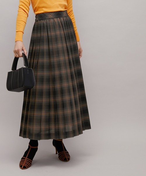 【素材】 ウールにポリエステルを混紡した上質な梳毛ビエラチェック。ウールの温かみと、繊細な透け感を持ち合わせた素材感で、暑い時期からも着用可能。絶妙なシャンブレー表現で、シワにもなりにくく、優しい肌触りでイージーに扱えるのもポイント。 【デザイン・シルエット】 軽さのある梳毛チェックでおつくりしているワンウェイプリーツスカート。すっきりと見える裾感で、Iラインのようなイメージで着用いただける大人エレガンスなシルエット。素材の軽さからうまれるゆれ感が女性らしく、素材の高級感もあり、素敵な大人の女性を演出してくれます。後ろウエストはゴム仕様ですので、イージーな着用が可能な点もうれしいポイント。 【カラー】 グレーベースとブラックベースのオンブレーチェック2色展開。 ブラックベースのみ同素材ブラウスとセットアップ着用可能です。 【おすすめのスタイリング】 ショートブーツでもロングブーツでも着用いただける着丈感です。エアリーなシルエットですので、毛足のあるニットとの相性よく着用いただけます。またブラックベースのチェックのみ同素材のブラウスとセットアップ可能でワンピース見えで着用できます。 ---------------------------- 透け感:少しあり 裏地:あり 伸縮性:なし 光沢感:なし 生地の厚さ:薄手 ポケット:なし 開き方:ファスナー 洗濯方法:ドライクリーニング ---------------------------- 【モデル情報】 モデル身長:171cm着用サイズ:38 ※画像の商品はサンプルです。 実際の商品と仕様、加工、サイズが異なる場合がございます。 ※撮影場所やライティング、お使いのモニター環境によって色の見え方が異なる場合がございます。 ※商品のカラーは画像の色味をご参照ください。動画は仕様説明のため、色味が実物と異なる場合がございます。