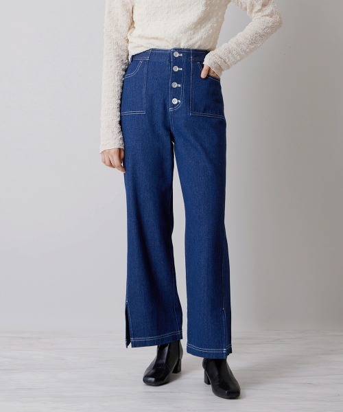 ◆すっきりシルエットで美脚効果抜群◆■デザインボタンフライ仕様が特徴のストレートデニムパンツ。前後に切替を入れ、脇線に切替を入れないことでシルエットをよりきれいに見せるデザインに仕上がっています。前裾にスリットを施し、ちらっと見える脚首が華奢に見せてくれます。展開カラーはネイビー、ブラックとベーシックな二色で、使いやすいです◎ポケット付きで利便性も良いのが嬉しいポイント。ウエスト後ろはゴム仕様で、着脱にストレスを感じずお召いただけます。■スタイリングセットアップ対応商品の為、合わせるトップスは(A1JJP21090)とお召いただくのがおすすめです。上下デニムでまとまりのあるスタイリングに仕上がります。■着用感ストレートシルエットで、穿くだけで美脚になれます。連続するボタンが可愛く、タックインスタイルが楽しめます。セットアップスタイルだけでなく、カットソーやニットなど合わせるアイテムはどれも相性が良く、コーディネートが楽しいです。【156㎝ 標準体型】…………………… 透け感:なし 厚さ:普通 伸縮性:なし …………………… ≪お気に入り登録機能の使い方≫ ■商品のお気に入り登録(ハートマークをクリック) 再入荷通知や値下げ等、お得なご案内を受けることができます。