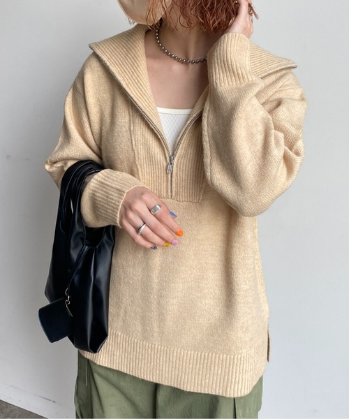 トレンドのハーフジップ×ビッグカラーがポイントのニットプルオーバー首元のハーフジップは、暖かなハイネックとして着たり、衿元を思いきり開けて抜け感を出したりとスタイリングに合わせてお好みのアレンジを楽しめます。サイドスリットで着膨れを気にせず着用できるのも嬉しいポイントの一つです。***********************商品の特徴透け感:なし裏地:なし伸縮性:あり光沢感:なし生地の厚さ:厚い洗濯・取り扱い洗濯:洗濯処理不可クリーニング:石油系溶剤による弱いドライクリーニングは可タンブル乾燥:アイロン:110度を限度ととしてスチームなしのアイロン仕上げ処理可***********************【POINT】・トレンドのハーフジップで2WAY楽しめる・着膨れしない程よい肉感で温かみのあるデザイン・身体のラインを拾わないルーズなサイズ感で体型カバー効果◎【COORDINATE】ロンTやシアーインナーをレイヤードして、こなれ感アップ。サイドスリットからチラ見せさせるのも◎ハーフパンツ×ロングブーツで大人っぽく決めたり、デニム×スニーカーでカジュアルダウンするのもおすすめです。タイトスカートやマーメイドスカートなど、コンパクトなボトムで全体のバランスがすっきりまとまったコーディネートに。【おすすめのスタイリングアイテム】ピンタック×ハイウエストワイドPT(PGL1022203A0001)チェックプリーツロングスカート(PGL1022201A0001)【お買い物をよりお楽しみいただくために】商品のお気に入り登録(ハートマークをクリック)完売カラーの再入荷通知や、ラスト1点の通知、セールの通知も受けることができます。ブランドのお気に入り登録新商品や再入荷など、いち早くブランドのお得な情報を受け取ることができます。※屋外での撮影画像は、光の当たり具合で色味が異なって見える場合があります。商品の色味は、スタジオでの詳細画像をご参照ください。※画像の商品はサンプルです。実際の商品と仕様、加工、サイズが若干異なる場合がございます。※ご注文いただいた予約商品のお届け時期の確認は、注文履歴ページより行えます。※実際にお届けする商品と仕様やサイズが異なる場合がございます。また生産の都合上、お届け時期が前後する場合がございます。CPCM(シーピーシーエム)「Capricious Playful & Curious Message」の略語。あらゆる文化と関わりながら、自由な(気まぐれな)遊び心で好奇心をそそるようなメッセージを発信していくブランドです。