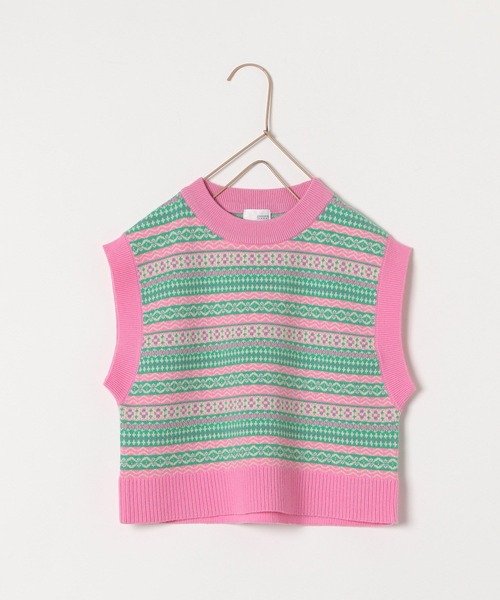 ■デザイン■ カラフルなジャガードのデザインがとっても可愛いベストです! 丈感はコンパクトですが、身幅がゆったりしているので、レイヤードしやすい1枚で着映えします。 襟・袖・裾が配色になっているのがポイント! 柄のカラーは少しレトロムードな優しい配色にしました。 着るだけで元気になるアイテムです! ■スタイリング例■ 171334 ジャガードニットカーディガンとアンサンプルとして着用するのがおすすめ。 ロンTやブラウスとレイヤードしたり、ベストなので色んな着方を楽しんで頂けます!