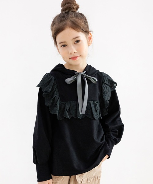 やや起毛感のあるスウェット地で柔らかく肌触りのいいパーカー★ フリルが大ぶりでかわいいがつまったアイテム! 首元のリボンもポイント♪