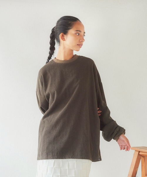 THING FABRICS ロングTシャツ 少し大きめの身幅とドロップした肩幅でゆとりを持たせ、程よい太さのアームと着丈でバランスを調整したボックスシルエットです。首回り、袖口、は別素材で編みたてたリブを短めに設定する事で、ミニマルな印象に仕上げました。シンプルなデザイン、シルエットの良さで長く愛用頂けます。 良質の綿花栽培に適した条件に恵まれた土地、アメリカ合衆国カリフォルニア州のサンホーキンバレーで獲れる「サンホ―キン綿」を使用し、精紡交撚糸(せいぼうこうねんし)と呼ばれる紡績方法で撚り、オリジナルスパン糸を打ち込むことにより、ナチュラルなストレッチ性を持たせ、独特の光沢があり、薄く、柔らかく、しなやかな生地に仕上げております。 ※お客様のモニターの設定や閲覧環境(OSやブラウザのバージョン)によって、画面上と商品実物との色味が若干異なる場合があります。あらかじめご了承ください。