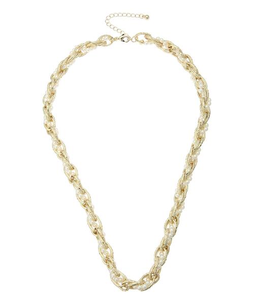 パール×メタルのMIXチェーンで華やかな印象に仕上げたネックレス。 ボリューム感のあるデザインが顔映えも明るく華やかな印象に見せてくれます。調整可能なアジャスター付きなのもポイント。 コーディネートにプラスワンするだけでも、スタイリングをブラッシュアップしてくれるアイテムです。 ※商品画像は、撮影環境やお客様のご利用のPC・スマートフォンのモニター環境などにより実物と色味に差異がある場合がございます。 【その他採寸】 F 全長:41cm(アジャスター5cm)