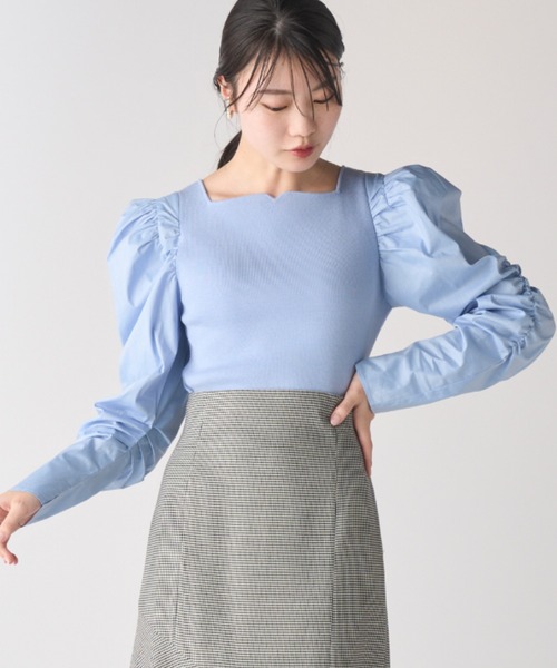 衿ぐりは高めのスクエアで、前衿ぐりは中心に向かって少し上に上がるようなラインにしているのがポイントです。中心に上品なあさめで丸みのある刻みを入れています。高めのウエスト位置で少しウエストシェイプして、スタイルが良く見えるように工夫しています。肩は小さめに作り、袖山に切り替えを入れてギャザーを入れ、モードな仕上がり。ボトムを選ばず万能な1枚です。袖はシャツ地素材使用。