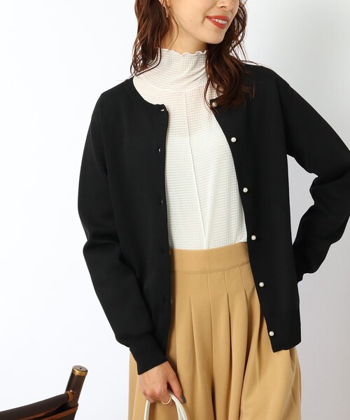 ■ポイント ・洗濯機で洗える! ・前後2WAYで着用できる。 ・パール調のボタンがアクセントに。 ■デザイン 柔らかく、スポンディッシュな膨らみと軽さが特徴のニットカーディガン。 程よい肉感がありながらも、軽い着心地で気軽に着て頂きやすいアイテムです。 洗濯機洗いOKなのも嬉しいポイント。 ■スタイリング 前後2WAYで着用していただけます。 ベーシックなデザインですが、パール調ボタンで、カジュアル過ぎず上品なスタイルにも合わせて頂けます。 ■生地、素材感 生地感:ドライタッチな質感で、もっちり肉感のあるやわらかなニット素材 生地:ポリエステル100% 透け感:ややあり 伸縮性:あり 厚さ:普通 裏地:なし こちらの商品は主に冬に着用いただける商品です。 モデル情報:身長168cm B78 W58 H84 着用サイズ:02(M) 店舗へのお問い合わせ商品番号:741-35010 ●製品寸法: 02(M):着丈59cm B96cm 袖丈59cm 肩幅36cm 03(L):着丈60cm B100cm 袖丈59cm 肩幅37cm 04(LL):着丈62cm B104cm 袖丈59cm 肩幅39cm 備考: