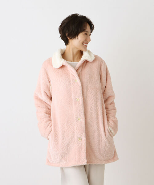 おうち時間やおやすみ前もあたたかく過ごせるガウンです。表面にオパール加工を施し、凹凸感のある独特の模様を表現したデザイン。お部屋にやさしく馴染む、上品で落ち着きのある色合いをセレクトしました。 冷えやすい腰まわりやお尻まわりをすっぽりカバーする丈感で、もこもこのボアに包まれるあたたかな着心地です。 サイドポケットにはスマートフォンなどちょっとした小物を入れられます。内側は湿気を吸って熱に変える吸湿発熱加工付き。 さらに摩擦時の嫌なパチパチ感を抑えてくれる静電気抑制加工を施し、快適に過ごせるうれしい機能をプラスしました。 *洗濯の際はネットを使用してください。 *1点ごとに柄の出方が違うことがあります。 *写真撮影時以外はマスクを着用し、十分な距離を保ち安全に考慮しております。