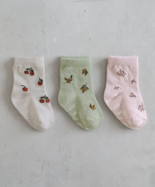 かわいいくて使いやすい、ボタニカル クールソックス(オリーブ/チェリー/小花)3足セットかわいい総柄のボタニカル クールソックス3足セットです。「オリーブ柄×くすみグリーンカラー」「チェリー柄×アイスベージュカラー」「小花柄×くすみピンクカラー」の3色展開で、かわいいくてコーディネートしやすく、使いやすいデザインです。