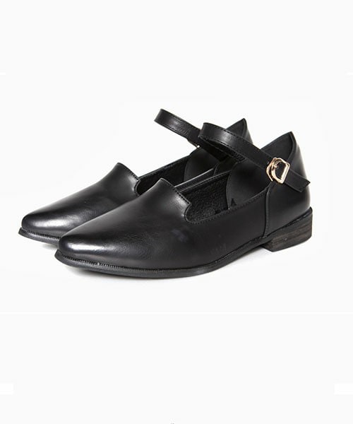 つま先が尖がったポインテッドトゥシューズ。ストラップ付デザインなので歩きやすい。どんなアイテムにも合う優秀な一足です。